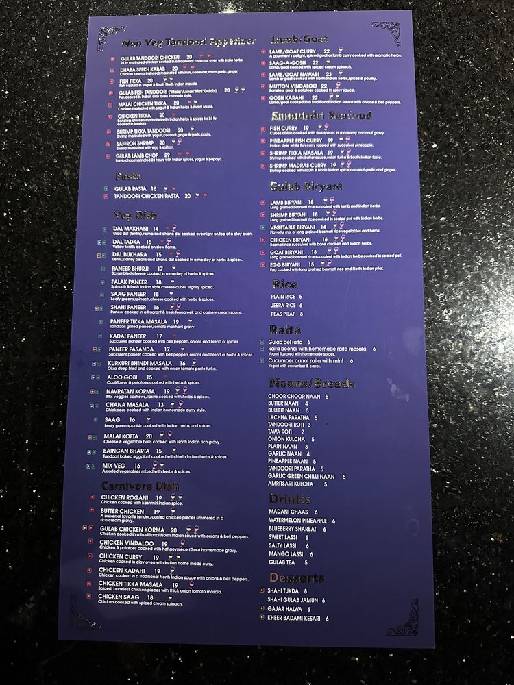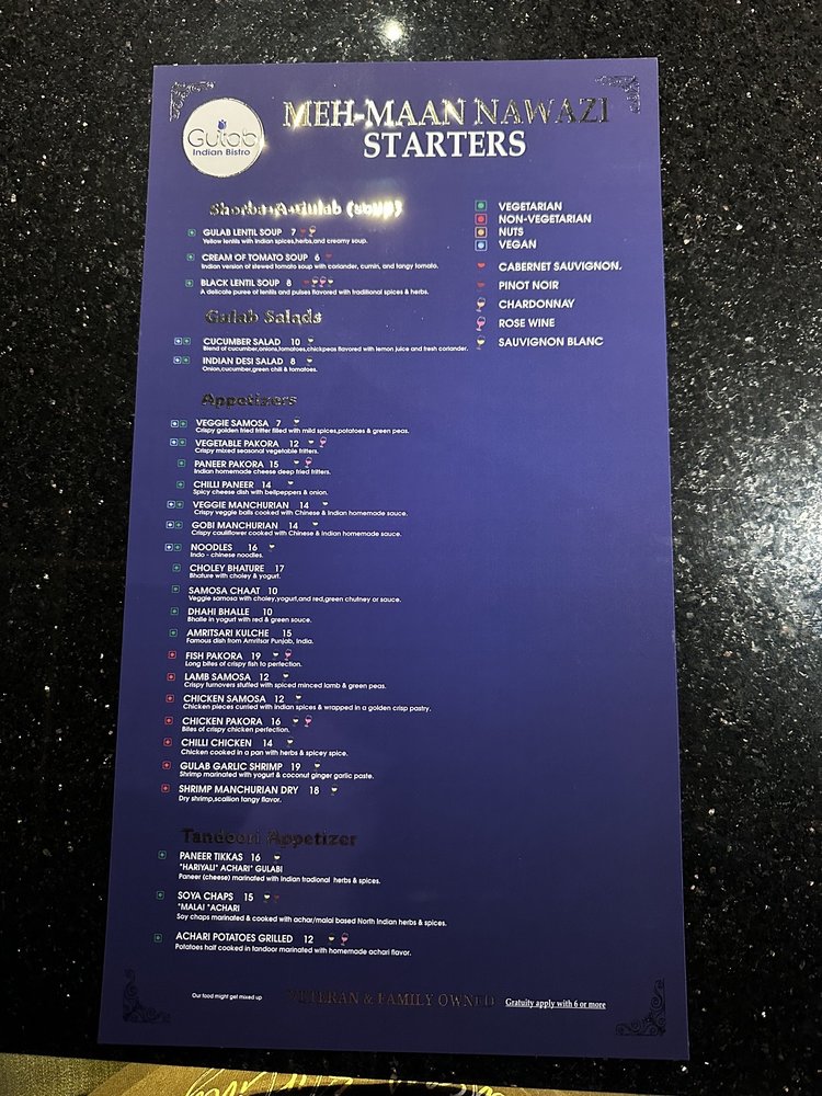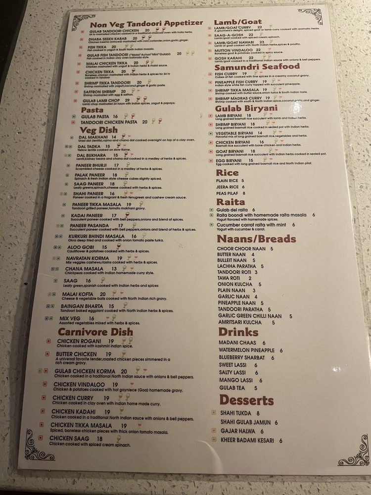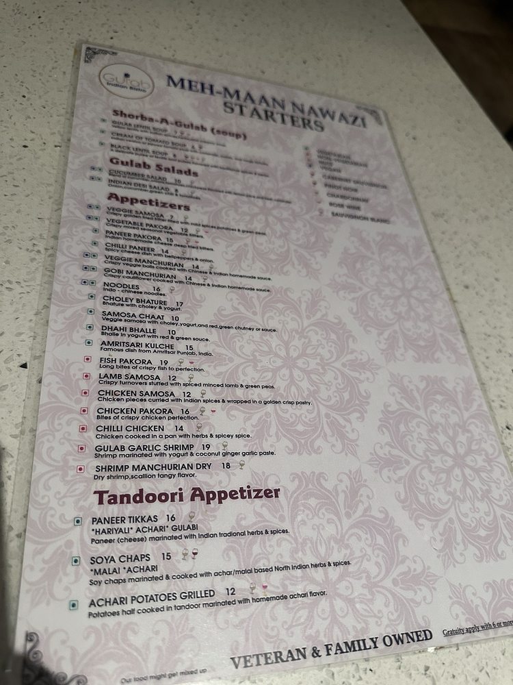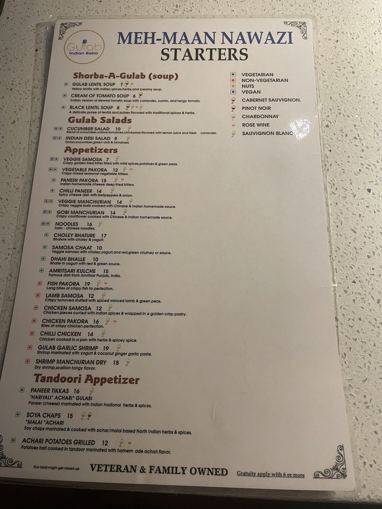 Introducing the menu at Gulab Indian Bistro, located in Clovis, CA, offering a delightful blend of Indian and Asian cuisine. From Black Lentil Soup to Chicken Pakora and Vegetable Biryani, the menu boasts a wide variety of traditional dishes bursting with flavors. The restaurant prides itself on its classy ambiance, excellent service, and diverse selection of dishes suitable for all tastes. With options for vegetarians and meat lovers alike, Gulab Indian Bistro provides a unique dining experience for all. Customers rave about the impeccable service, beautiful plating, and unbeatable flavors, making it a go-to spot for authentic Indian cuisine. Whether you're a fan of spiced, flavorful dishes or looking to explore new flavors, Gulab Indian Bistro is the perfect destination for an unforgettable dining experience.