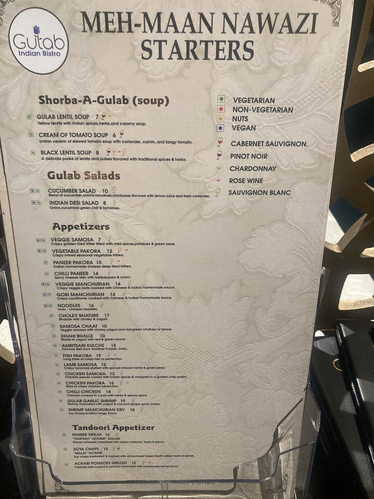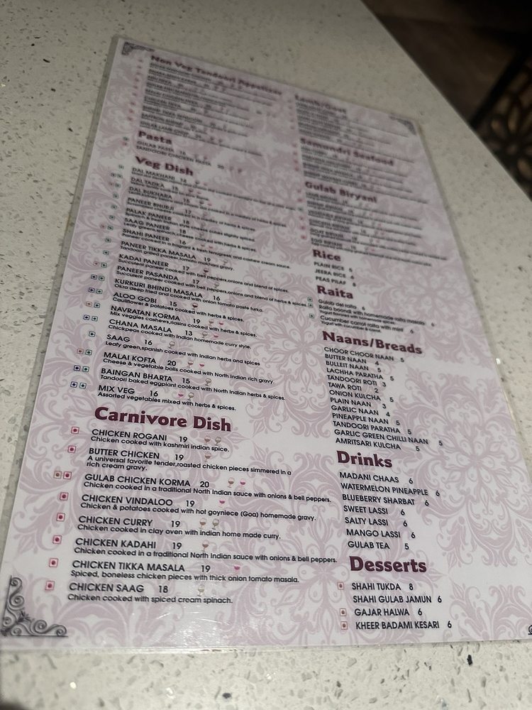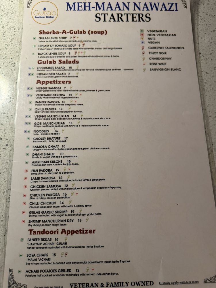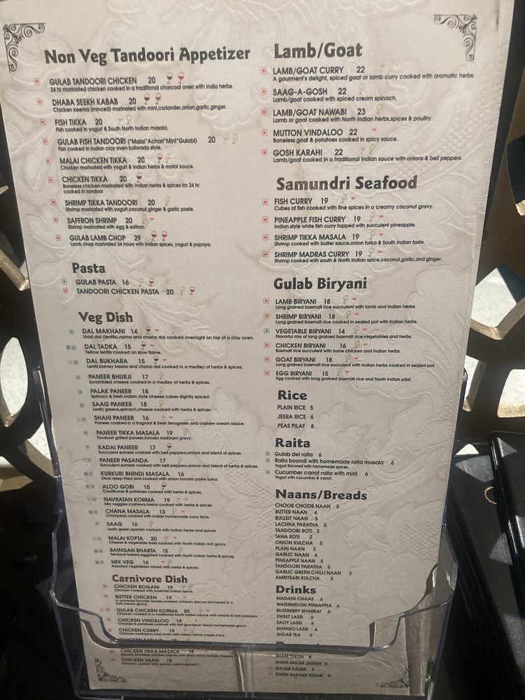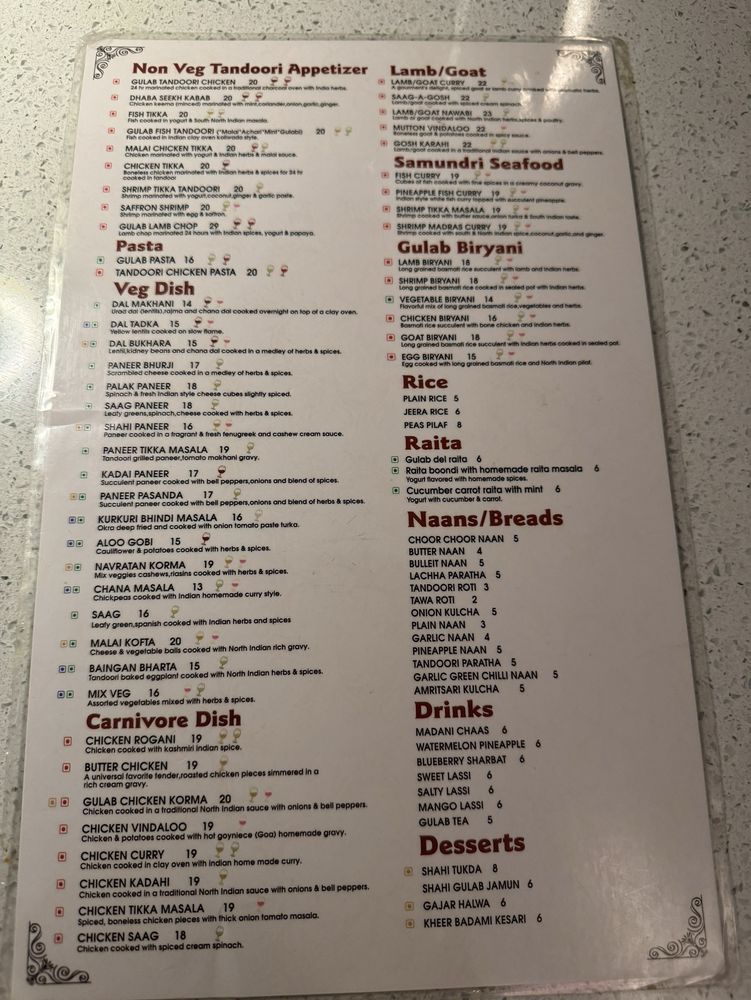 Introducing the menu at Gulab Indian Bistro, located in Clovis, CA, offering a delightful blend of Indian and Asian cuisine. From Black Lentil Soup to Chicken Pakora and Vegetable Biryani, the menu boasts a wide variety of traditional dishes bursting with flavors. The restaurant prides itself on its classy ambiance, excellent service, and diverse selection of dishes suitable for all tastes. With options for vegetarians and meat lovers alike, Gulab Indian Bistro provides a unique dining experience for all. Customers rave about the impeccable service, beautiful plating, and unbeatable flavors, making it a go-to spot for authentic Indian cuisine. Whether you're a fan of spiced, flavorful dishes or looking to explore new flavors, Gulab Indian Bistro is the perfect destination for an unforgettable dining experience.